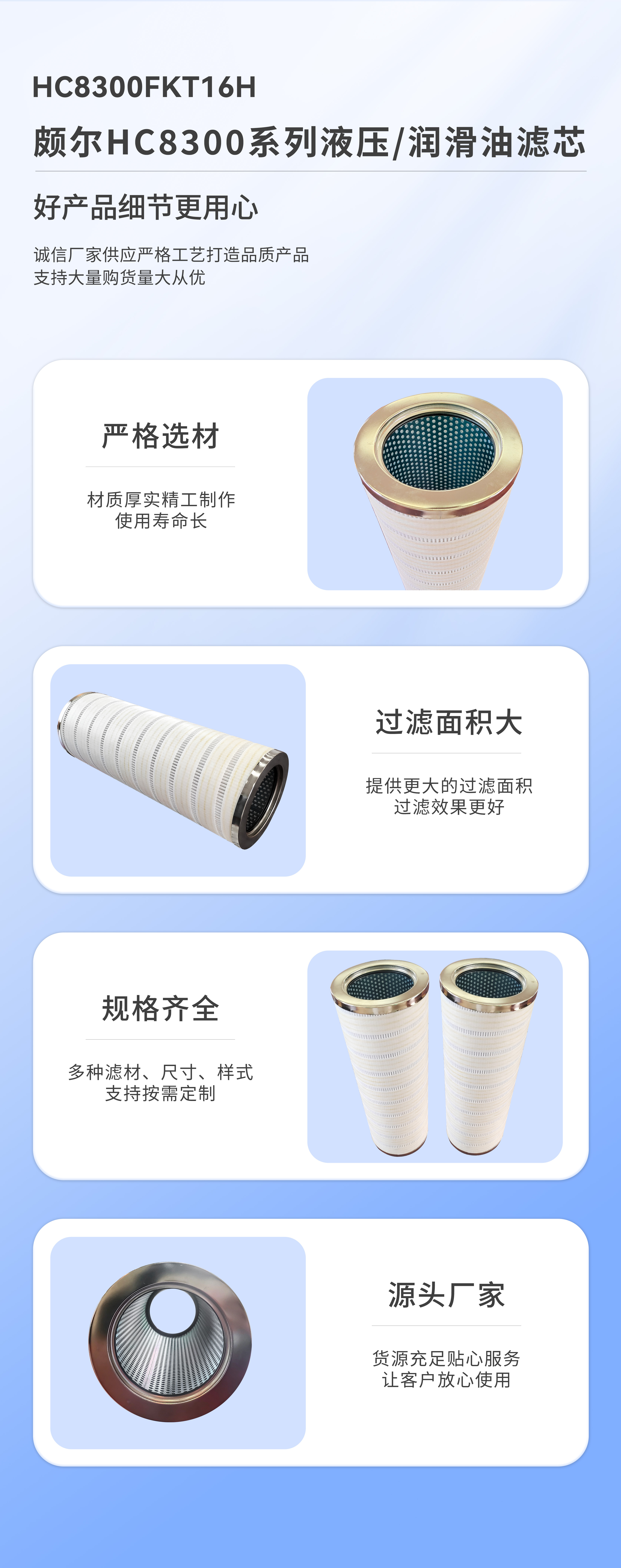 【產品簡介】: 頗爾濾芯HC8300系列用于液壓、潤滑系統的壓油過濾,用以濾除系統中污染物,系統的正常運行,公司生產的濾芯采用的是進口濾材,具有的技術含量,納污除塵的性能較強,完全可以替代進口的濾芯使用。